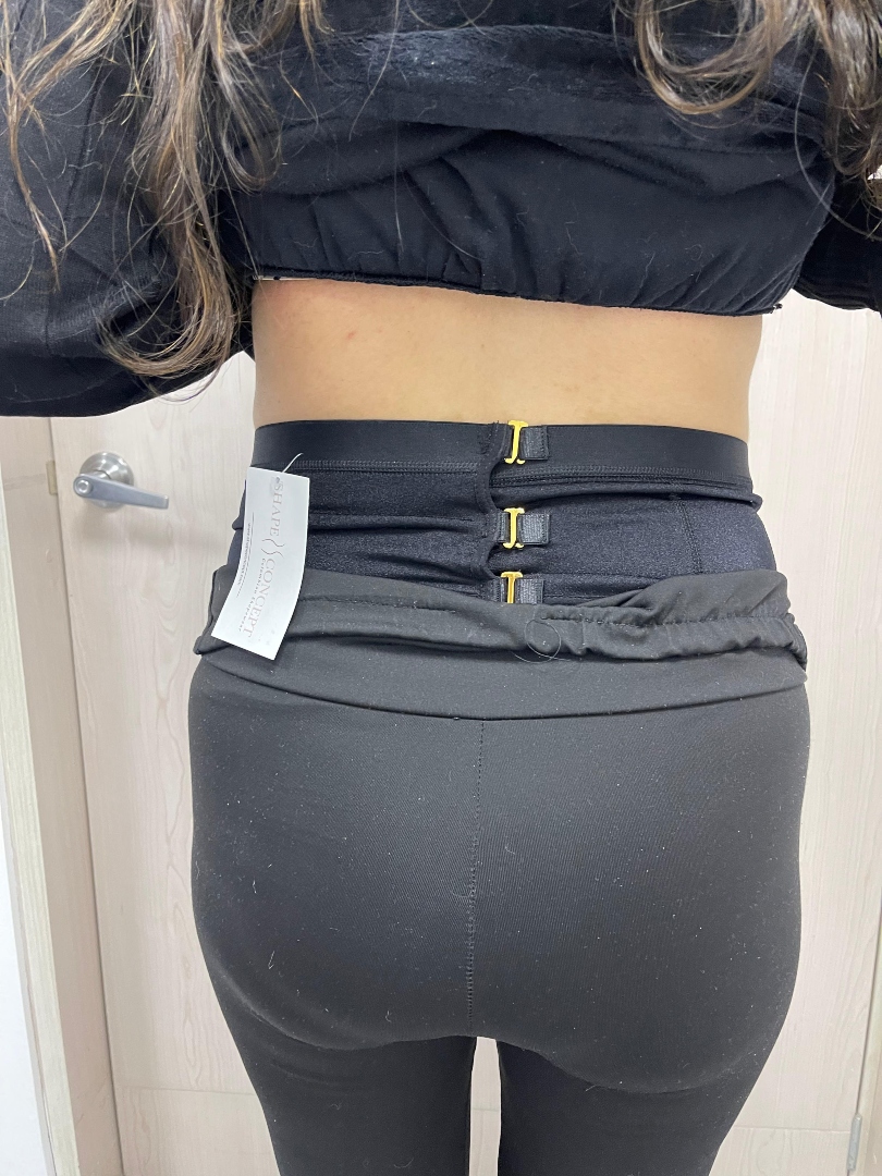 - Ajusta la faja en la parte delantera, colocando el elástico debajo o encima de tu ombligo y a los lados, sobre tus caderas.